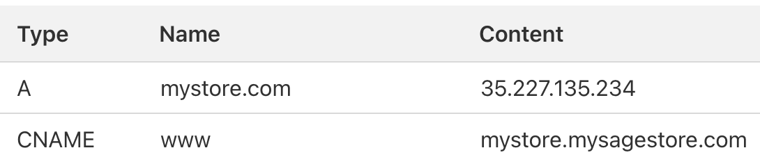 If your domain is a naked domain (not a subdomain), e.g. domain.com or anotherdomain.com, it will need to be pointed to an A record using the same IP address of your web store domain, e.g. mystore.store.commercebuild.com. (note: older stores may be using our previous domain format: mystore.mysagestore.com)