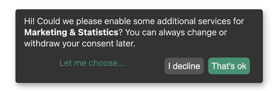 This is the basic out-of-the box configuration. But Klaro also includes the ability to offer much more complex and detailed consent options, as well as different language translations, and custom CSS. You can view their full documentation here →