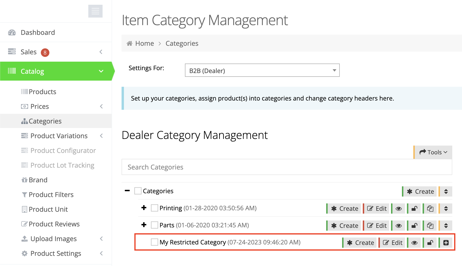 If the first checkbox next to "All Categories" is ticked, that means that all users assigned to this group have access to all products within all categories. Because the goal is to restrict access to a specific category of products, you will want to change this setting.