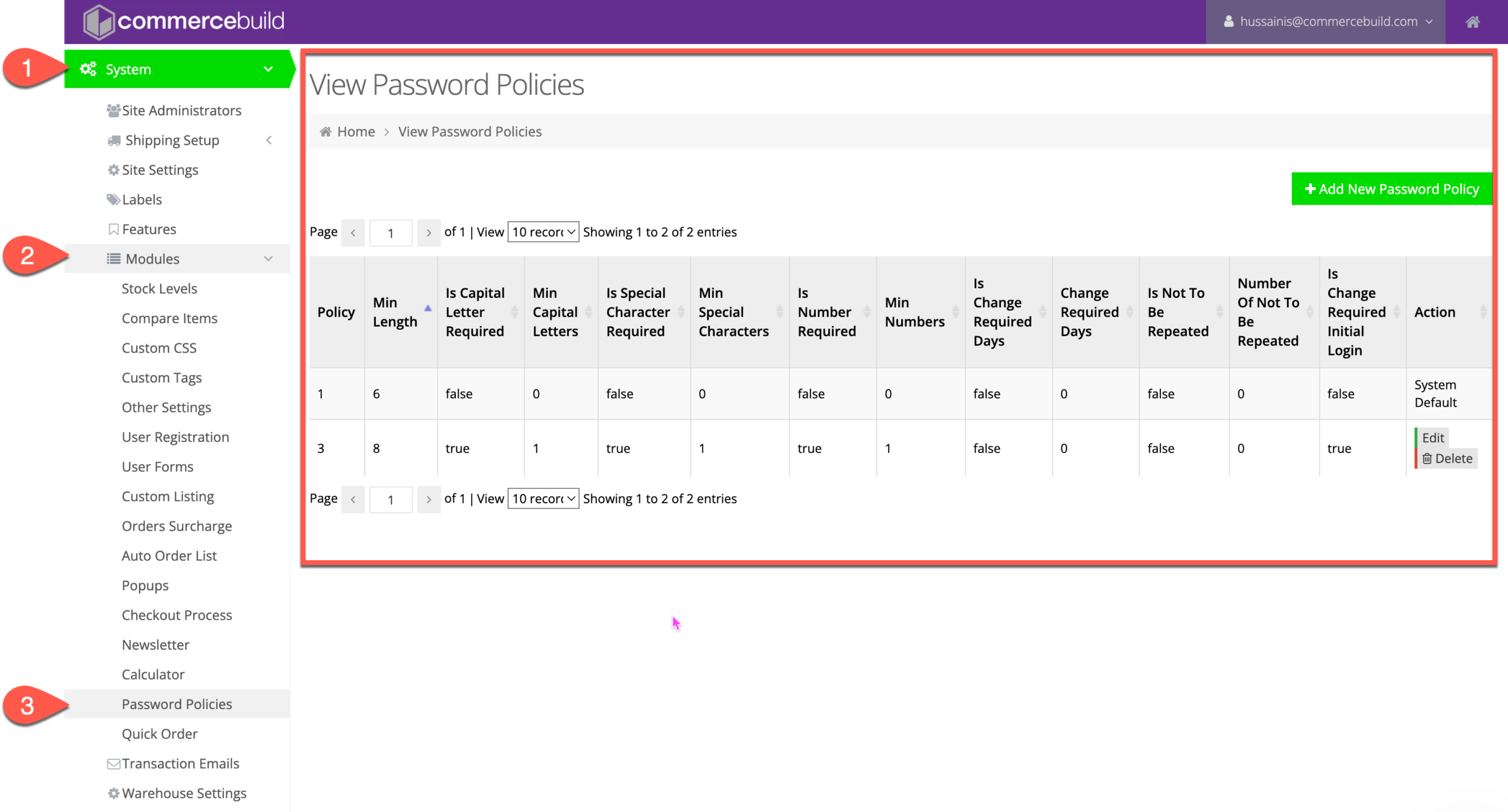 Once the customer support team has enabled the password policy feature for your web store, follow these steps to create a password policy: