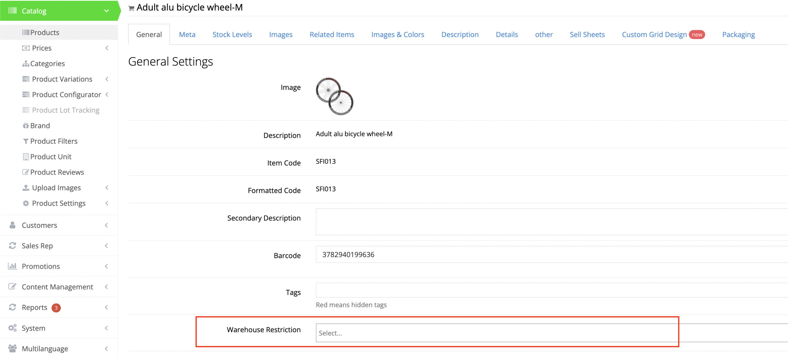 Once the feature has been enabled, you will have a new field called "Warehouse Restriction" when editing products under Catalog → Products.