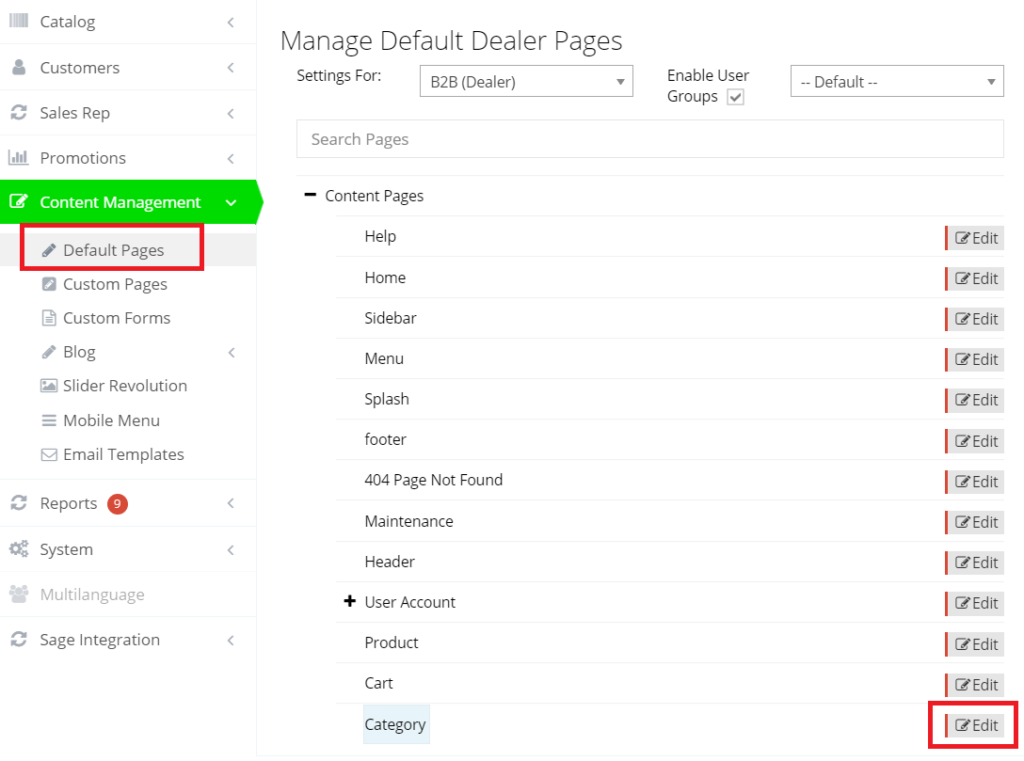In your admin dashboard, navigate to Content Management > Default Pages and click Edit next to the "Category" content page.