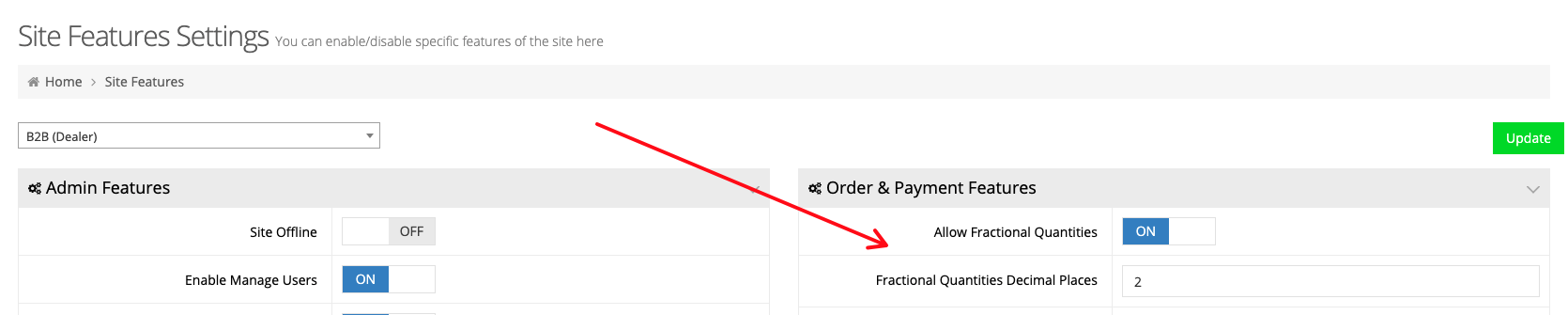 To achieve this, you need to activate Allow Fractional Quantities and also set the number of decimal places. For example, if a user could order 1.25 units of an item, then you would need to set Fractional Quantities Decimal Places to 2.