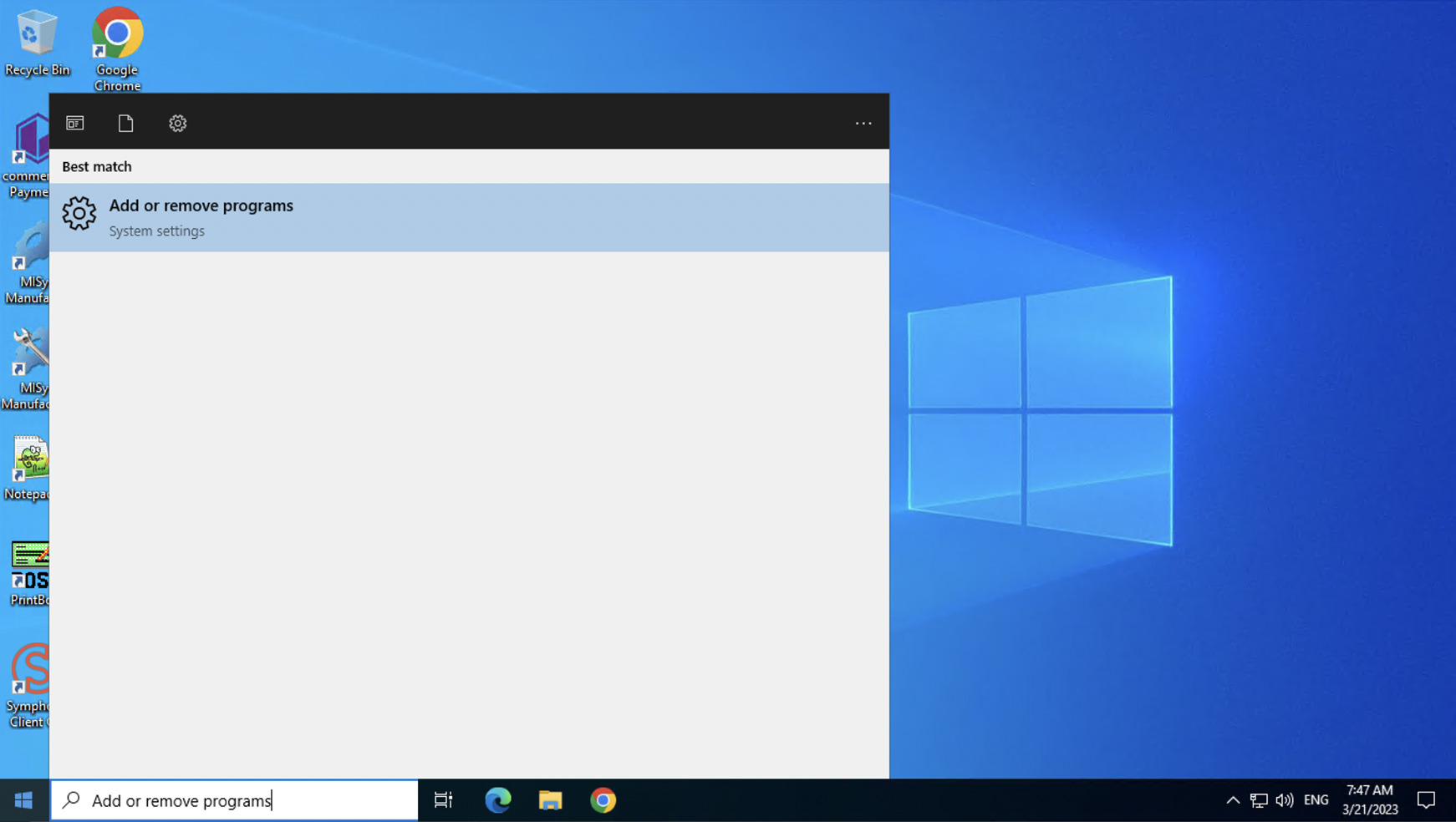 To check the version of commercebuild Payments that your system is running, click the Start button, type "Add or remove programs" and then click the match that appears:
