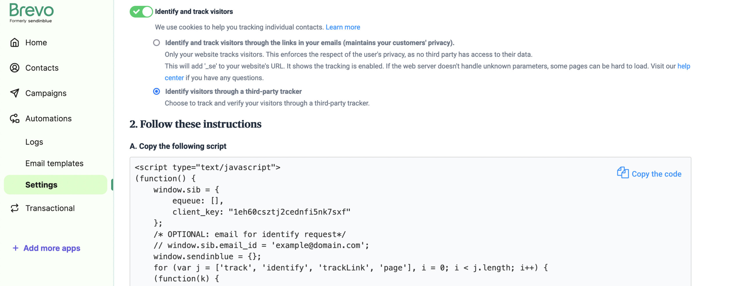 Firstly, copy/paste Brevo's JavaScript snippet from their dashboard. It should look something like this: