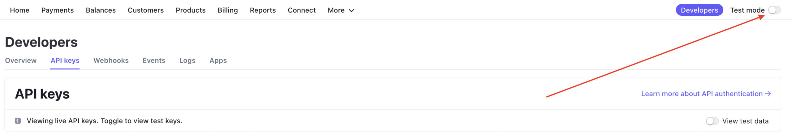 Log into your Stripe account and navigate to https://dashboard.stripe.com/apikeys. First decide if you want your account in "Test Mode" (for testing purposes). If so, be sure to toggle on that option.