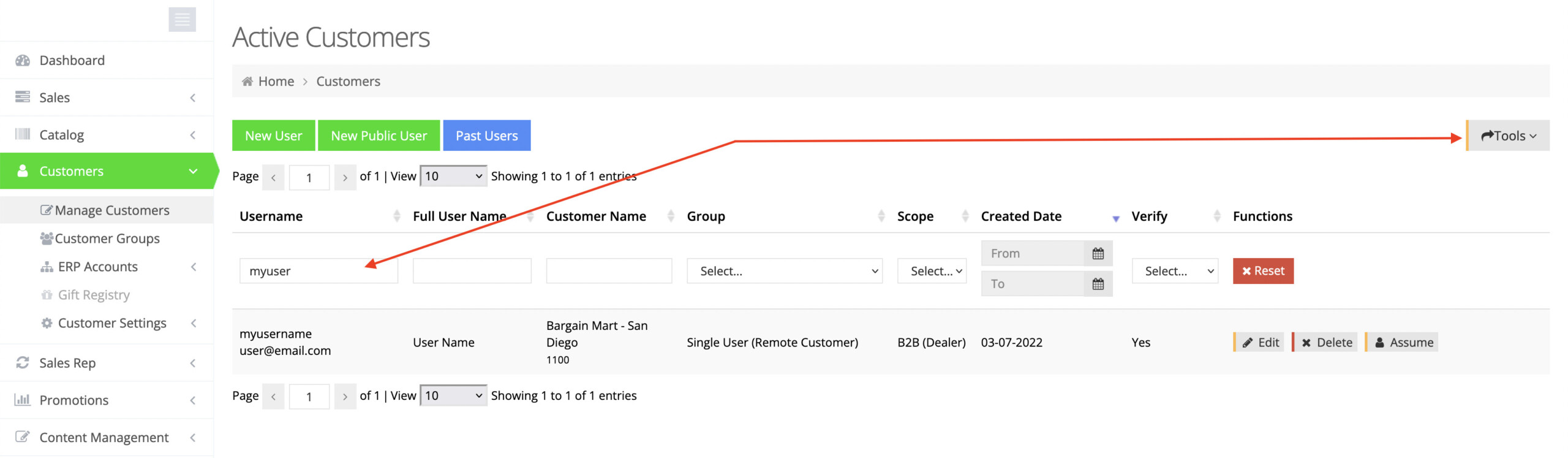 To verify that the web store user has been converted to B2C successfully, return to Customers > Manage Customers, and search for the web store user in question. The user should look something like this: