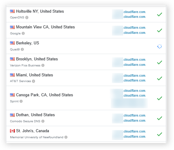To get started, you will need a Cloudflare account, and your web store will also need to have its DNS hosted at Cloudflare. Not sure if your web store uses Cloudflare? Go to DNS Checker, select "NS" (name servers) from the dropdown menu, type the naked domain, and click "Search". If the name servers that appear have "cloudflare.com" in them, then your company is using Cloudflare. Here is a sample screenshot: