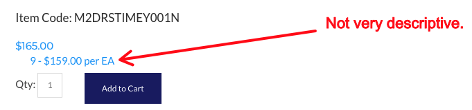 If a product in your web store has volume discount pricing, there are some changes to the Product Page Labels you can make to have those volume discounts appear in a more descriptive manner.