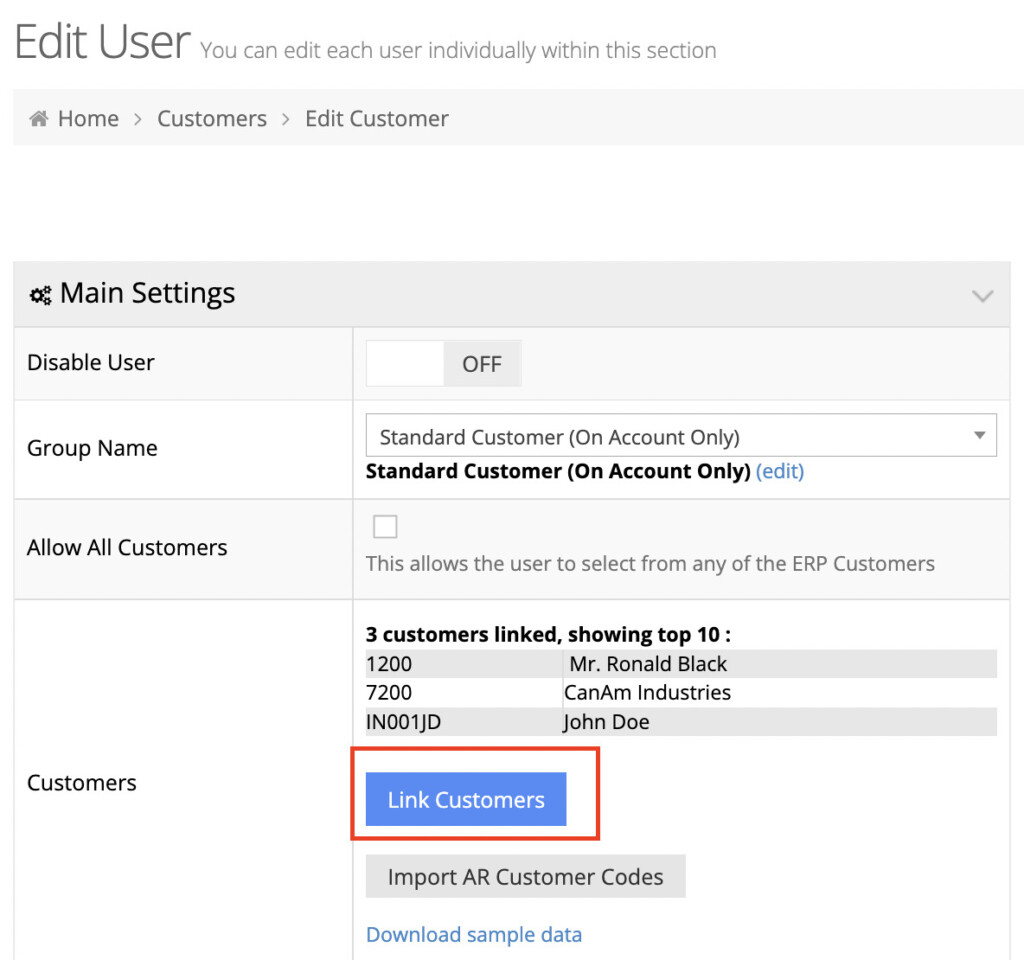 Click “Edit” next to that customer in the table and on the Edit User landing page, click the button "Link Customers".