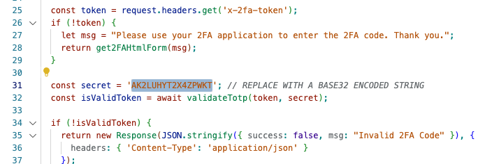 Before you "Save and deploy" your worker, be sure that you update the secret constant with the value you've generated. For the purposes of this documentation, you'd need to change the secret to AK2LUHYT2X4ZPWKT: