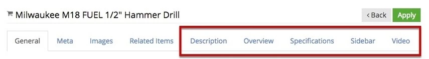 Remember to click apply after each tab has been populated as well. Adding content to multiple tabs before clicking Apply may result in some tabs not saving correctly.