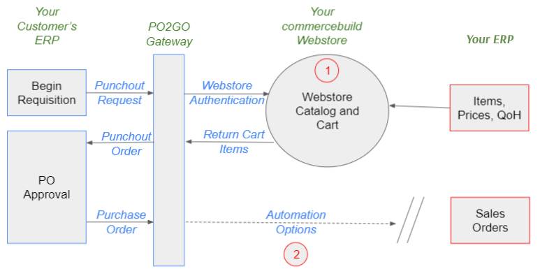 This allows your customers to easily create purchase orders or requisitions, and ensures that they have access to all of the products and prices available on your web store (see "1" in the process flow).