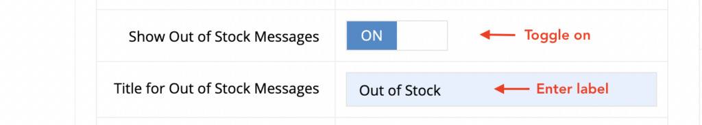 Locate and enable Show Out of Stock Messages and enter a text in the Title for Out of Stock Messages field.