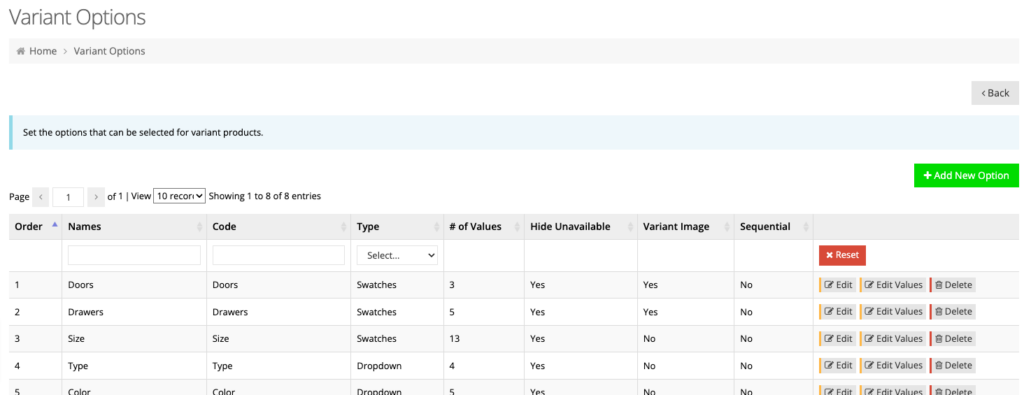Options for variant products are defined and managed here. This may include options like size or color and defines how the option is displayed on the page.