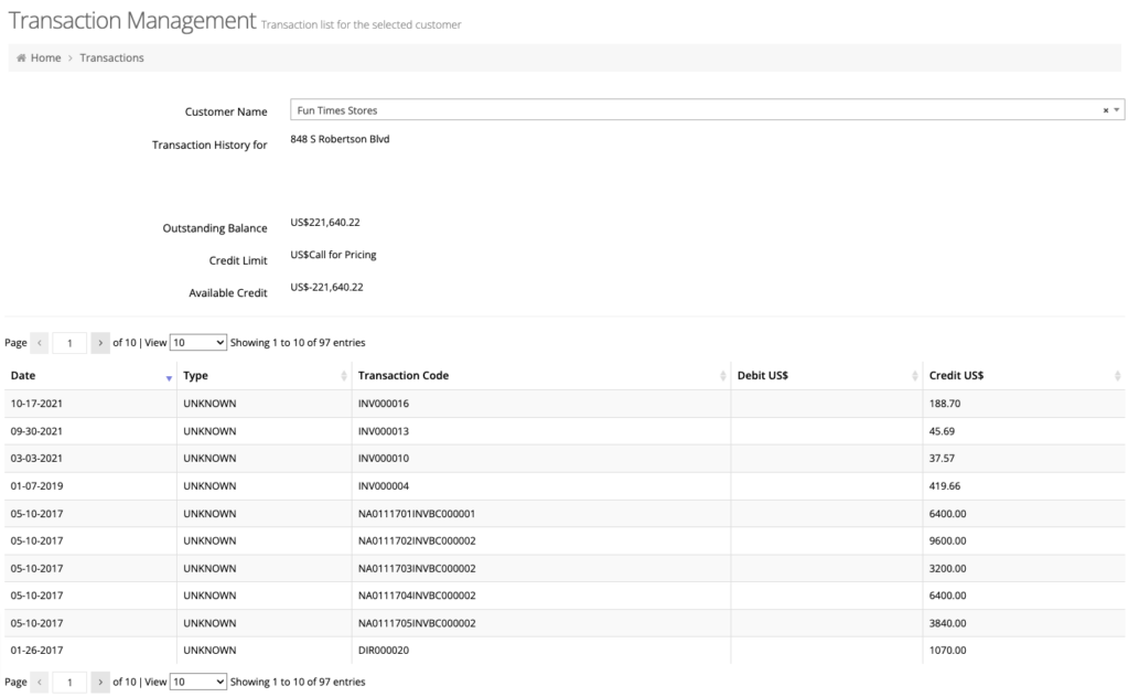 To display a table with transactional history, search for (and select) a customer from the search drop-down. Basic financial information and transactional history for the customer will appear, including any outstanding account balance, credit limit, etc.