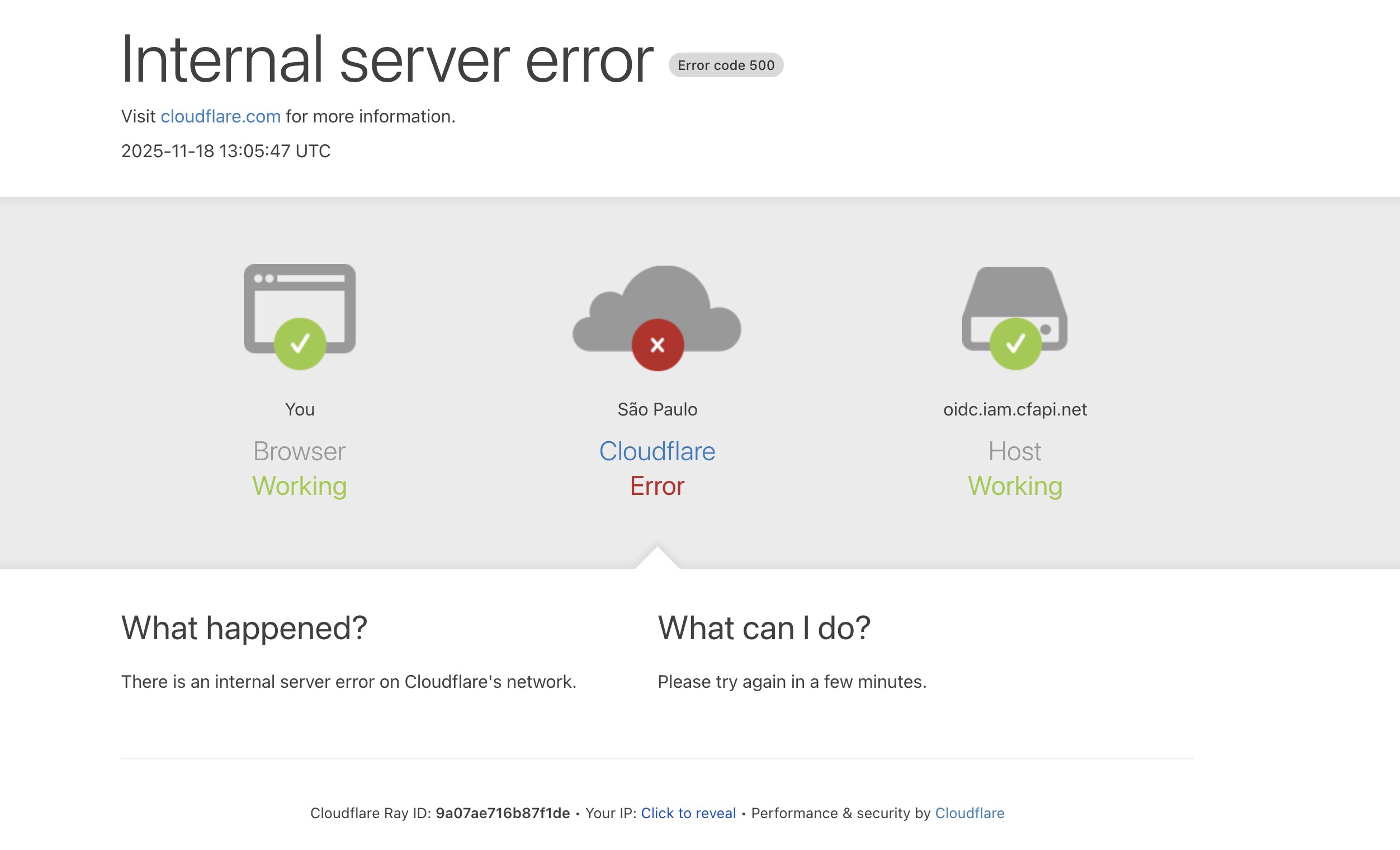 13:10 UTC - Cloudflare is experiencing issues that may result in 500 errors when trying to access sites using their services. The issue appears to be intermittent. If you see the screen below when trying to access your site, your site is being affected by this issue.